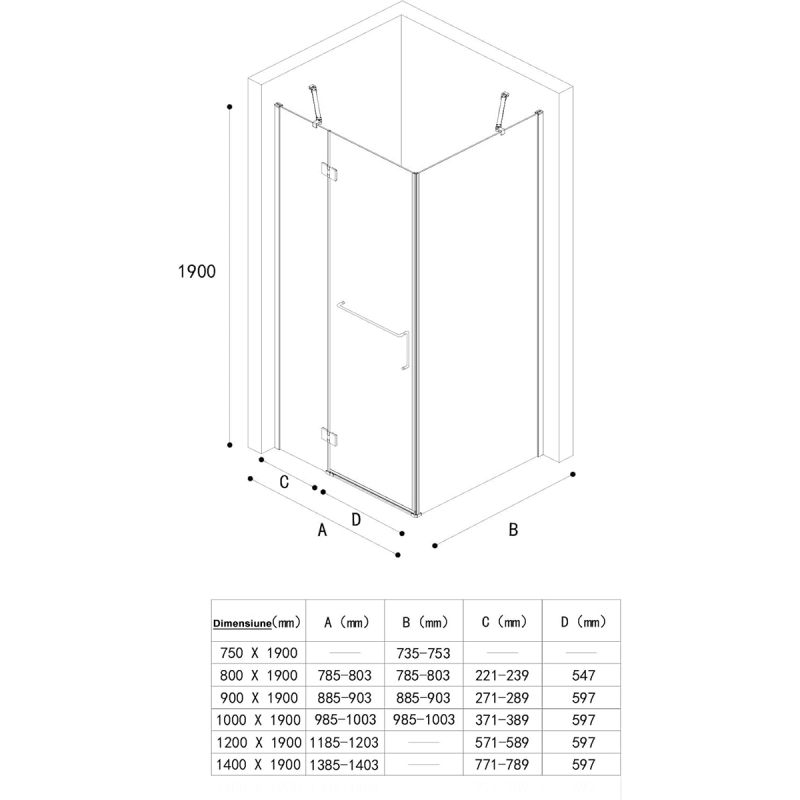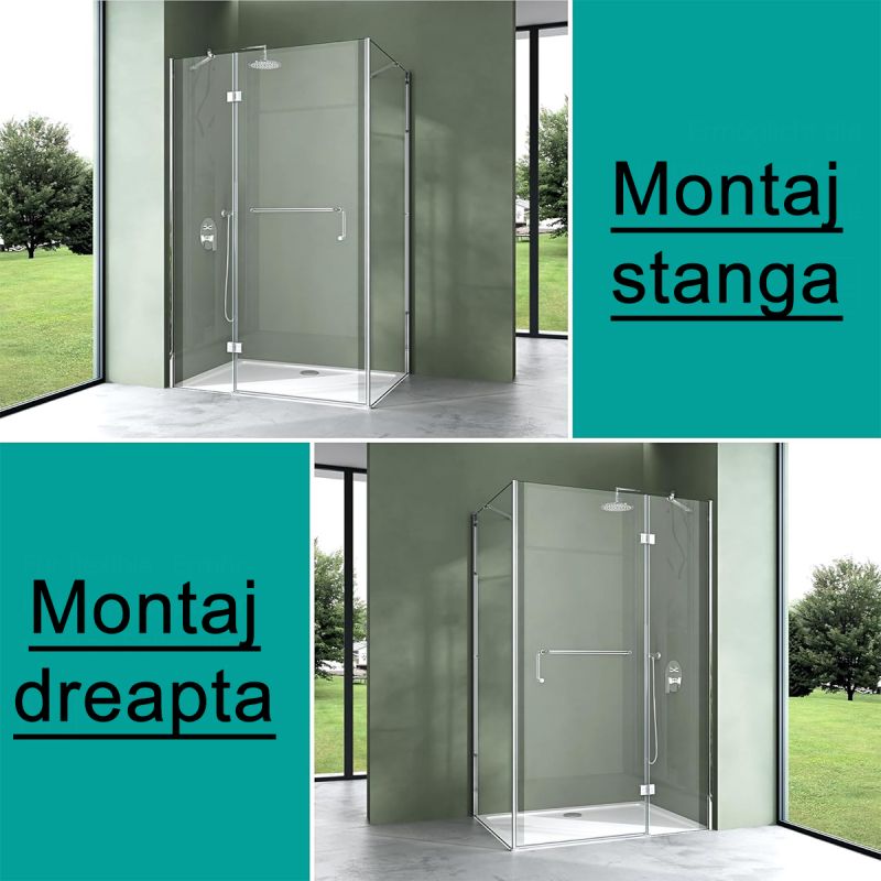 Cabina 04, perete fix si usa batanta, sticla securizata 6 mm, dimensiune 75-100x90-140 cm