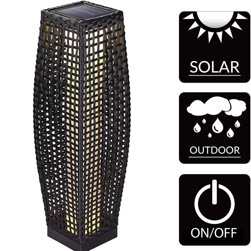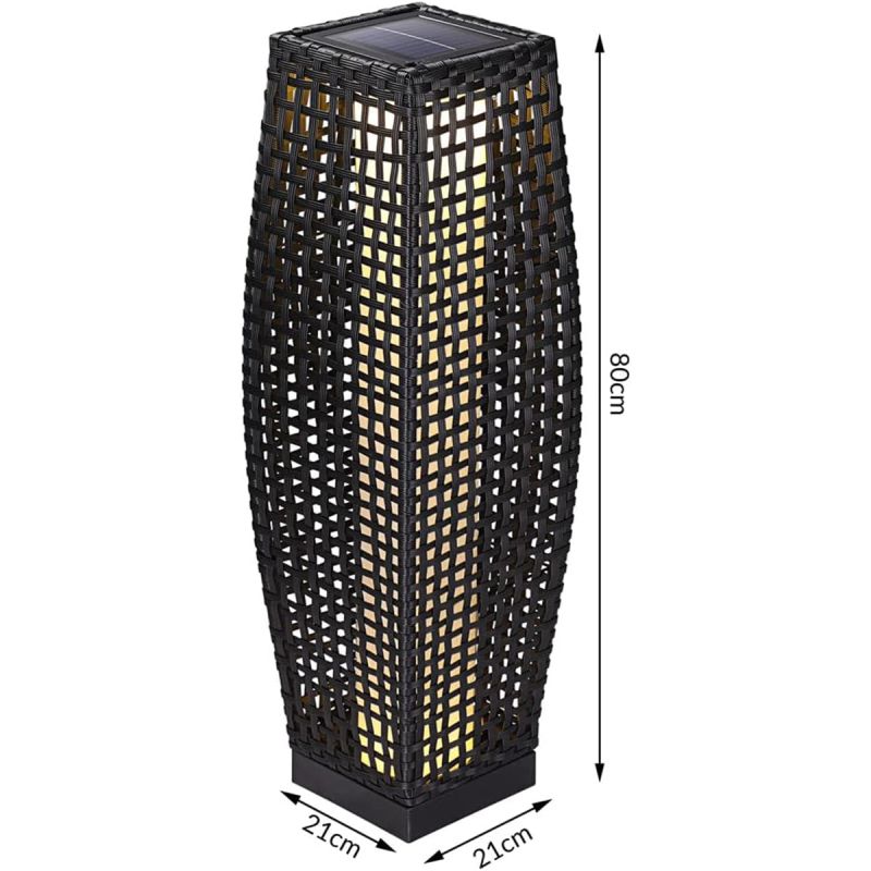 Cu o inaltime de 80 cm si dimensiuni echilibrate (21 x 21 cm baza), aceasta lampa solara devine un element decorativ statement, perfect pentru alei, intrari, langa mobilierul de terasa sau in gradina, printre plante ornamentale. Forma sa eleganta si textura impletita creeaza efecte spectaculoase de lumina si umbre, adaugand profunzime si rafinament spatiului exterior.