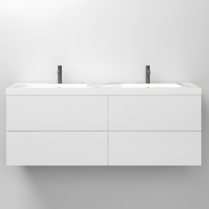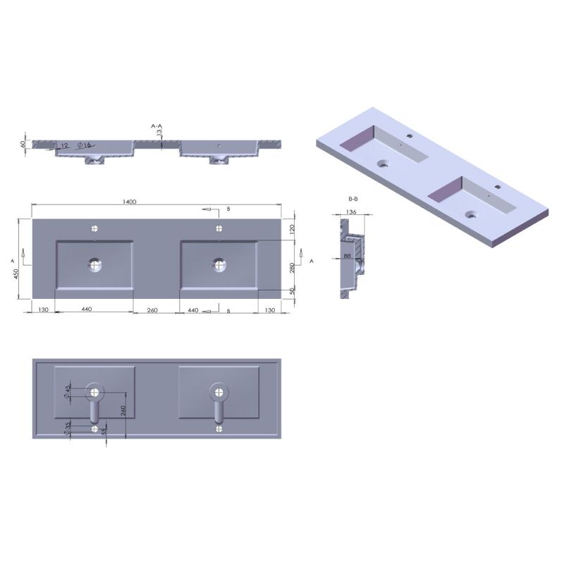 Lavoar dublu Paola, Alb finisaj Carrara Arabescato, compozit mineral, montaj semi-incastrat, cu 2 gauri de baterie, 140x45 cm