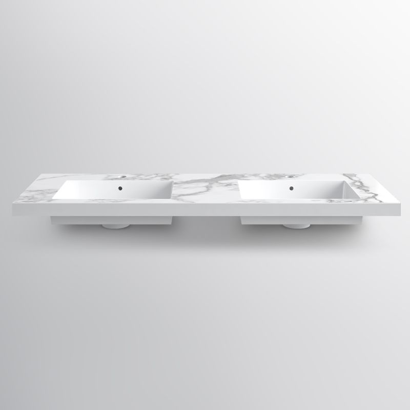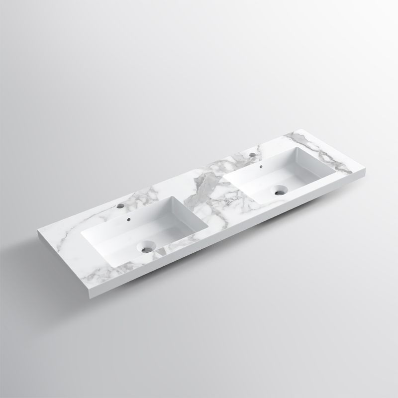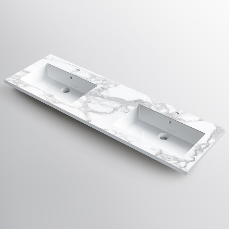 Lavoar dublu Paola, Alb finisaj Carrara Arabescato, compozit mineral, montaj semi-incastrat, cu 2 gauri de baterie, 150x46 cm