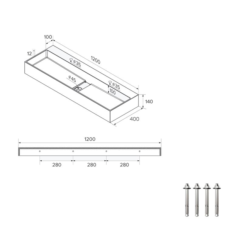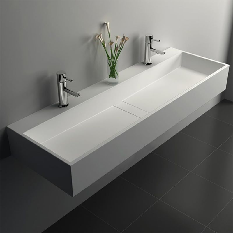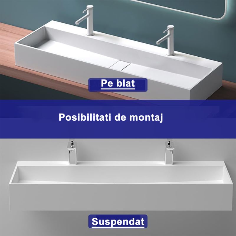 Lavoar 6028, Alb Lucios, 120x40 cm, scurgere ascunsa, cu 2 gauri de baterie, montaj pe blat, compozit mineral