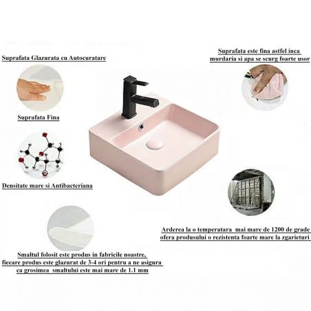 Durabilitate si Usurinta in Intretinere: Fabricat din ceramica sanitara, lavoarul este durabil si rezistent la uzura. Suprafata sa neteda si lucioasa este usor de curatat, mentinand aspectul sau elegant in timp.