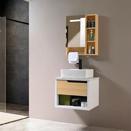 Combinatia dintre sertarul spatios si raftul deschis asigura un spatiu perfect structurat, pastrand la indemana produsele esentiale si mentinand baia ordonata.