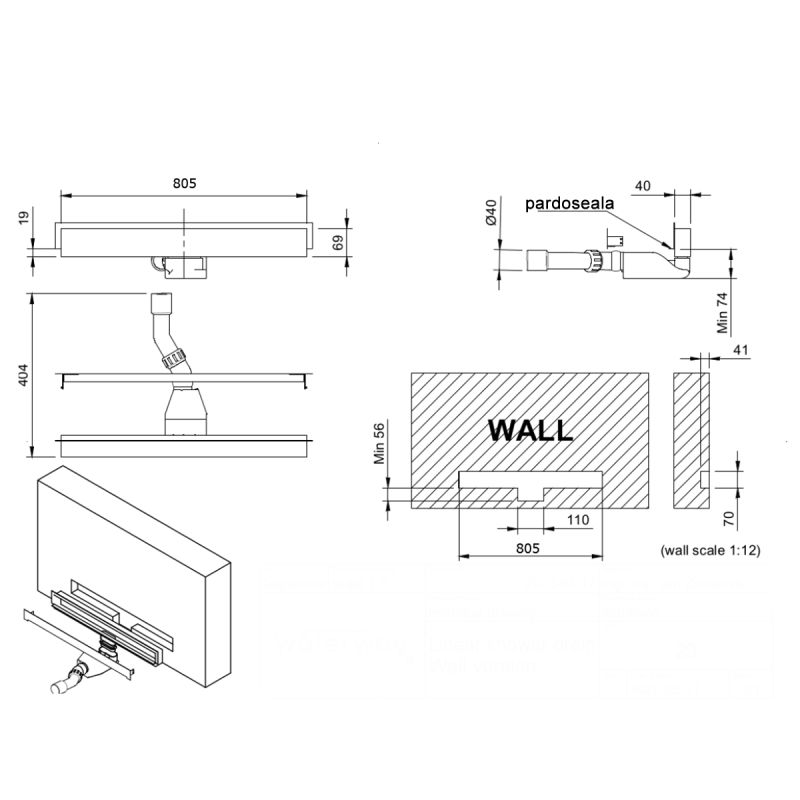 Adâncimea minimă de instalare a acestei scurgeri în perete este de 4,1 cm, în podea este de 7,4 cm.