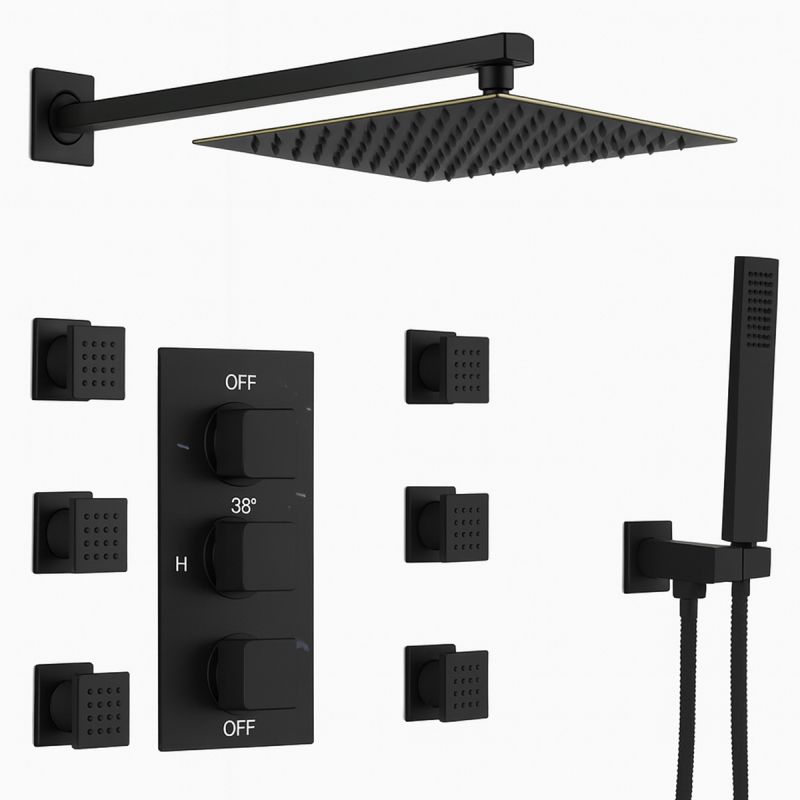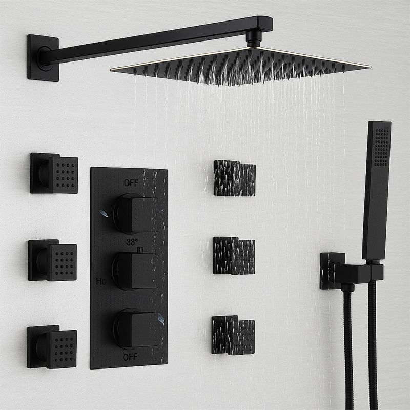 Sistem de dus cu termostat, 6 duze de masaj, montaj incastrat in perete, Alama, Negru, Vento