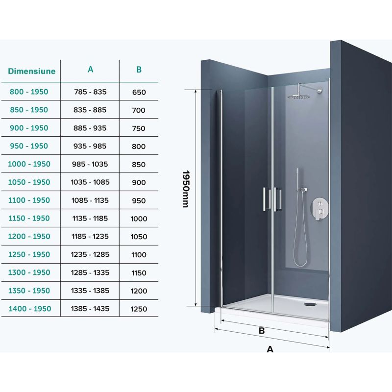 (Usa de nisa EGO-24D, sticla securizata 6 mm, Transparenta, Deschidere 180°, 80-85-100-140x195 cm, tratament Nano Easy Clean) :