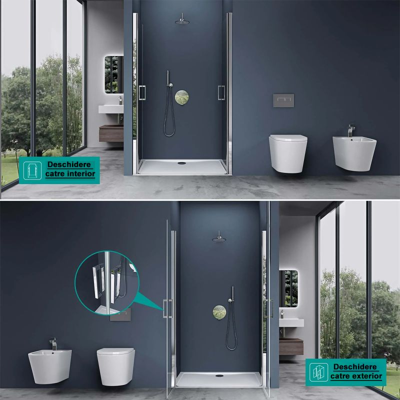 Acces facil si versatilitate maxima – datorita deschiderii bidirectionale la 180°, usa poate fi deschisa atat spre interior, cat si spre exterior, oferind confort sporit si adaptabilitate in orice spatiu de baie, indiferent de dimensiuni sau configuratie.